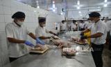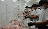 Pekerja memotong daging ayam di Rumah Potong Hewan Unggas (RPHU) Restu Jaya, Rawa Kepiting, Pulo Gadung, Jakarta Timur, Sabtu (4/5/2024). RPHU Restu Jaya mendistribusikan daging ayam potong ke seluruh pasar di Jakarta sebanyak 15-25 ton per hari dengan harga jual mulai dari Rp9.000 per kilogram untuk kepala ayam hingga Rp46.000 per kilogram untuk dada ayam fillet. Sementara, Pemerintah melalui Kementerian Perdagangan mewajibkan seluruh RPH memiliki sertifikat halal paling lambat hingga Oktober 2024 yang diatur melalui Undang-Undang No. 33 Tahun 2014 tentang sertifikat halal. (FOTO : Republika/Thoudy Badai)