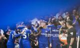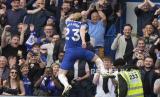 Cole Palmer dari Chelsea, tengah, merayakan bersama rekan satu timnya setelah mencetak gol pembuka timnya selama pertandingan sepak bola Liga Premier Inggris antara Chelsea dan West Ham United di stadion Stamford Bridge di London, Inggris, Ahad (5/5/2024). (FOTO : AP Photo/Frank Augstein)
