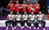 REPUBLIKA.CO.ID, CHENGDU. -- Tim bulu tangkis putra Indonesia menerima medali saat Upacara Penghargaan Pemenang Piala Thomas 2024 di Chengdu Hi Tech Zone Sports Center Gymnasium, Chengdu, China, Ahad (5/5/2024).