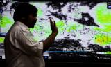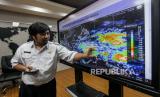 Petugas Badan Meteorologi, Klimatologi dan Geofisika (BMKG) memberikan penjelasan pada layar yang menampilkan citra satelit cuaca di Kantor BMKG, Jakarta, Senin (6/5/2024). BMKG menyatakan fenomena cuaca panas yang terjadi di Indonesia bukanlah gelombang panas atau heatwave melainkan diakibatkan proses peralihan musim hujan ke musim kemarau atau pancaroba. Tercatat selama sepekan terakhir suhu udara maksimum tertinggi di Indonesia terjadi di Palu hingga mencapai 378 derajat celcius pada 23 April lalu. (FOTO : Republika/Putra M. Akbar)
