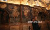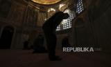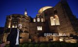 Seorang ulama Muslim berjalan di sepanjang bekas gereja Bizantium yang resmi dibuka sebagai masjid, di Istanbul, Turki, Senin, (6/5/2024). (FOTO : AP)