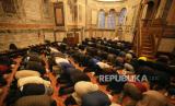 Jemaah Muslim melaksanakan salat magrib di bekas gereja Bizantium yang resmi dibuka sebagai masjid, di Istanbul, Turki, Senin, (6/5/2024). (FOTO : AP)