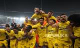 Para pemain Borussia Dortmund melakukan selebrasi usai laga leg kedua semifinal Liga Champions antara Paris Saint-Germain dan Borussia Dortmund di stadion Parc des Princes di Paris, Prancis, Rabu, (8/5/2024) dini hari WIB. (FOTO : AP Photo/Frank Augstein)