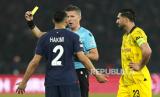 Achraf Hakimi dari PSG berdebat dengan wasit Daniele Orsato saat pertandingan sepak bola leg kedua semifinal Liga Champions antara Paris Saint-Germain dan Borussia Dortmund di stadion Parc des Princes di Paris, Prancis, Rabu, (8/5/2024) dini hari WIB. (FOTO : AP Photo/Lewis Joly)