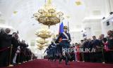 Vladimir Putin berjalan untuk mengambil sumpahnya sebagai presiden Rusia saat upacara pelantikan di Istana Grand Kremlin di Moskow, Rusia, Selasa, (7/5/2024). (FOTO : AP)