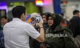 Petugas melayani calon penumpang yang mendaftarkan face recognition untuk memasuki gerbang menuju peron di Stasiun Gambir, Jakarta, Rabu (8/5/2024). (FOTO : Republika/Putra M. Akbar)