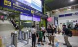 Petugas melayani calon penumpang yang akan melakukan face recognition untuk memasuki gerbang menuju peron di Stasiun Gambir, Jakarta, Rabu (8/5/2024). (FOTO : Republika/Putra M. Akbar)