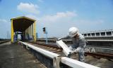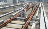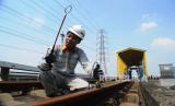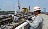 Petugas melakukan pengecekan arus listrik sistem persinyalan pada jalur rel di Area Depo LRT Jakarta, di Pegangsaan Dua, Jakarta Utara, Rabu (8/5/2024). (FOTO : Republika/Tahta Aidilla)