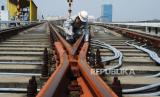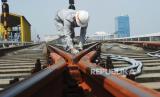 Petugas melakukan pengecekan fungsi persimpangan (Wessel) jenis Scissor Crossing pada jalur rel di Area Depo LRT Jakarta, di Pegangsaan Dua, Jakarta Utara, Rabu (8/5/2024). (FOTO : Republika/Tahta Aidilla)