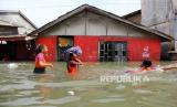 Sejumlah pelajar melintasi banjir rob di Medan Utara, Medan, Sumatera Utara, Rabu (8/5/2024). Badan Meteorologi Klimatologi dan Geofisika (BMKG) Stasiun Meteorologi Kelas II Maritim Belawan memperkirakan banjir rob yang melanda daerah tersebut akan berlangsung hingga 11 Mei 2024 dengan tinggi air mencapai 2,7 meter. (FOTO : ANTARA FOTO/Yudi Manar)