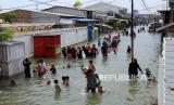 Warga melintasi banjir rob di Medan Utara, Medan, Sumatera Utara, Rabu (8/5/2024). Badan Meteorologi Klimatologi dan Geofisika (BMKG) Stasiun Meteorologi Kelas II Maritim Belawan memperkirakan banjir rob yang melanda daerah tersebut akan berlangsung hingga 11 Mei 2024 dengan tinggi air mencapai 2,7 meter. (FOTO : ANTARA FOTO/Yudi Manar)