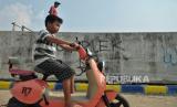 Warga mengendarai sepeda listrik melintas di dekat tanggul pengaman pantai yang retak di kawasan pesisir Kalibaru, Cilincing, Jakarta, Kamis (9/5/2024). Tanggul yang berfungsi mengurangi dampak banjir rob dan rembesan air laut sekitar Cilincing itu mengalami keretakan sehingga dapat membahayakan warga yang beraktivitas di kawasan tersebut. (FOTO : Republika/Thoudy Badai)