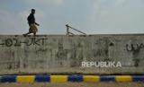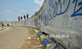 REPUBLIKA.CO.ID, JAKARTA -- Warga berjalan diatas tanggul pengaman pantai yang retak di kawasan pesisir Kalibaru, Cilincing, Jakarta, Kamis (9/5/2024).