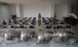 Petugas membersihkan ruang makan untuk jamaah calon haji di Asrama Haji Embarkasi Jakarta-Bekasi, Jawa Barat, Jumat (10/5/2024). Asrama Haji Embarkasi Jakarta-Bekasi sudah siap menyambut kedatangan para jemaah calon haji. Berbagai fasilitas telah disiapkan untuk menyambut kedatangan jemaah di antaranya kamar tidur, kursi roda, ruang makan serta sejumlah fasilitas lainnya. Dijadwalkan kloter pertama akan tiba di Asrama tersebut pada besok Sabtu (11/5/2024). Embarkasi Asrama Haji Jakarta-Bekasi akan melayani sebanyak 63 kloter. (FOTO : Republika/Prayogi)