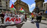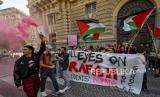 Anggota kelompok Jaringan Mahasiswa untuk Palestina melakukan protes di luar kantor pusat perusahaan pelayaran dan logistik Israel, di Naples, Italia, (10/5/2024). (FOTO : ANSA)