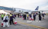REPUBLIKA.CO.ID, PALEMBANG -- Calon jamaah haji kelompok terbang (kloter) pertama Embarkasi Palembang berjalan menuju pesawat di Bandara Internasional Sultan Mahmud Baddarudin (SMB) II Palembang, Sumatra Selatan, Ahad (12/5/2024).