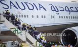 Jamaah calon haji kelompok terbang (kloter) pertama embarkasi Palembang, menaiki tangga pesawat di Bandara Internasional Sultan Mahmud Baddarudin (SMB) II Palembang, Sumatera Selatan, Ahad (12/5/2024). Sebanyak 450 jamaah calon haji asal Kabupaten Musi Banyuasin (Muba) dan Palembang diberangkatkan ke Madinah, Arab Saudi, untuk menunaikan ibadah haji. (FOTO : ANTARA FOTO/Nova Wahyudi)