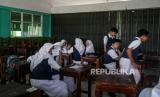 Pelajar mengikuti ujian sekolah di SMK Lingga Kencana, Depok, Jawa Barat, Senin (13/5/2024). Pasca kecelakaan bus rombongan pelajar di Ciater, Subang, Jawa Barat, yang menewaskan 11 orang tersebut, sekolah itu tetap melaksanakan kegiatan belajar mengajar seperti biasa meskipun sedang dalam masa berkabung. (FOTO : Republika/Putra M. Akbar)