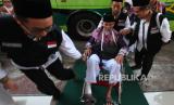 Sejumlah petugas kloter membantu seorang calon haji menuju gedung Muzdalifah usai turun dari bus di Asrama Haji Embarkasi Surabaya (AHES), Surabaya, Jawa Timur, Senin (13/5/2024). Sebanyak 742 jamaah calon haji dan petugas dari kloter 11 dan 12 asal Kabupaten Tuban tiba di AHES dan selanjutnya akan diberangkatkan ke Tanah Suci pada Selasa (14/5). (FOTO : ANTARA FOTO/Didik Suhartono)