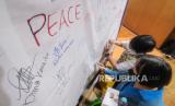 Warga menulis ucapan di atas kain saat peringatan enam tahun tragedi bom Surabaya di Gereja Katolik Santa Maria Tak Bercela, Surabaya, Jawa Timur, Senin (13/5/2024). Peringatan tersebut dilakukan dengan doa bersama, penyalaan lilin, dan tabur bunga oleh warga, pemuka agama, keluarga serta kerabat korban. (FOTO : ANTARA FOTO/Rizal Hanafi)