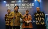 Direktur Utama Bank Syariah Indonesia (BSI) Hery Gunardi (kedua kiri) didampingi oleh jajaran direksi memberikan keterangan seusai meresmikan instrumen keuangan syariah Sustainability Sukuk BSI atau Sukuk Mudharabah Keberlanjutan di Jakarta, Rabu (15/5/2024). BSI menerbitkan instrumen keuangan syariah yang fokus terhadap ESG (environment, social, governance) berupa Sustainability Sukuk BSI atau Sukuk Mudharabah Keberlanjutan. (FOTO : Dok Republika)