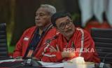 Ketua DPP PDIP Bidang Ideologi dan Kaderisasi seklaigus Steering Committee (SC) Rakernas PDIP ke V Djarot Saiful Hidayat (kiri) bersama Ketua DPP PDIP Bidang Pemuda dan Olahraga Eriko Sotarduga (kanan) bersiap menyampaikan keterangan pers terkait pelaksanaan Rakernas PDIP V di Kantor DPP PDIP, Jakarta, Kamis (16/5/2024). PDIP akan menggelar ke V pada 24-26 Mei di kawasan Ancol dengan mengambil Tema Satyam Eva Jayate, Kebenaran Pasti Menang, dan Sub Tema: Kekuatan Persatuan Rakyat, Jalan Kebenaran Yang Berjaya. Rencananya PDIP tidak mengundang Presiden Joko Widodo dan Wakil Presiden Maruf Amin dalam Rakernas ke V tersebut. (FOTO : Republika/Prayogi)