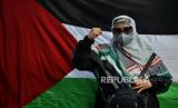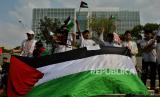 Massa yang tergabung dalam Aqsa Working Group (AWG) menggelar aksi solidaritas untuk Palestina di depan Kedubes Amerika, Jakarta, Jumat (17/5/2024). Aksi tersebut dalam rangka memperingati 76 tahun peristiwa Nakba yakni peristiwa pemindahan, penganiayaan dan pendudukan serta pengusiran oleh Israel yang menyebabkan lebih dari 750.000 warga Palestina mengungsi pada peristiwa tersebut. Aksi tersebut juga menyerukan penghentian pembantaian yang dilakukan oleh Israel dalam konflik perang di Palestina. (FOTO : Republika/Thoudy Badai)