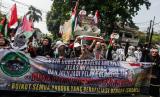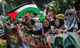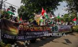 Sejumlah massa melakukan Aksi Bela Palestina di depan Kedutaan Besar Mesir, Jakarta, Ahad (19/5/2024). Pada aksi tersebut mereka menuntut pemerintah Mesir agar segera membuka pintu perbatasan Rafah untuk memperlancar penyaluran bantuan bagi warga Palestina di tengah gempuran dari Israel. (FOTO : Republika/Putra M. Akbar)
