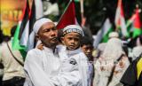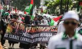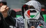 REPUBLIKA.CO.ID,  JAKARTA. --  Sejumlah massa melakukan Aksi Bela Palestina di depan Kedutaan Besar Mesir, Jakarta, Ahad (19/5/2024).