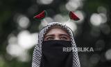 Massa memakai bando semangka saat melakukan Aksi Bela Palestina di depan Kedutaan Besar Mesir, Jakarta, Ahad (19/5/2024). Pada aksi tersebut mereka menuntut pemerintah Mesir agar segera membuka pintu perbatasan Rafah untuk memperlancar penyaluran bantuan bagi warga Palestina di tengah gempuran dari Israel. (FOTO : Republika/Putra M. Akbar)