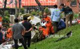 Petugas gabungan mengevakuasi korban pesawat yang jatuh di Lapangan Sunburst Bumi Serpong Damai (BSD), Tangerang Selatan, Banten, Ahad (19/5/2024). Pesawat jenis Cessna 2006 dengan kode registrasi PK-IFP TECNAM milik Indonesia Flying Club terjatuh dikawasan tersebut sekitar pukul 13.45 WIB yang menyebabkan tiga orang meninggal dunia yakni satu orang penerbang, satu orang teknisi dan satu orang penumpang. Sementara, tim dari Komite Nasional Keselamatan Transportasi bersama Inspektorat Penerbangan dari Ditjen Perhubungan Udara serta kepolisian setempat belum memberikan keterangan dan masih mendalami penyebab terjadinya kecelakaan pesawat tersebut. (FOTO : Republika/Thoudy Badai)