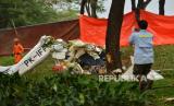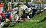 Petugas gabungan mengidentifikasi puing-puing pesawat yang jatuh di Lapangan Sunburst Bumi Serpong Damai (BSD), Tangerang Selatan, Banten, Ahad (19/5/2024). Pesawat jenis Cessna 2006 dengan kode registrasi PK-IFP TECNAM milik Indonesia Flying Club terjatuh dikawasan tersebut sekitar pukul 13.45 WIB yang menyebabkan tiga orang meninggal dunia yakni satu orang penerbang, satu orang teknisi dan satu orang penumpang. Sementara, tim dari Komite Nasional Keselamatan Transportasi bersama Inspektorat Penerbangan dari Ditjen Perhubungan Udara serta kepolisian setempat belum memberikan keterangan dan masih mendalami penyebab terjadinya kecelakaan pesawat tersebut. (FOTO : Republika/Thoudy Badai)