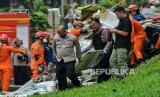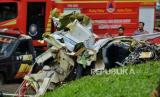 Petugas membawa puing-puing pesawat yang jatuh di Lapangan Sunburst Bumi Serpong Damai (BSD), Tangerang Selatan, Banten, Ahad (19/5/2024). Pesawat jenis Cessna 2006 dengan kode registrasi PK-IFP TECNAM milik Indonesia Flying Club terjatuh dikawasan tersebut sekitar pukul 13.45 WIB yang menyebabkan tiga orang meninggal dunia yakni satu orang penerbang, satu orang teknisi dan satu orang penumpang. Sementara, tim dari Komite Nasional Keselamatan Transportasi bersama Inspektorat Penerbangan dari Ditjen Perhubungan Udara serta kepolisian setempat belum memberikan keterangan dan masih mendalami penyebab terjadinya kecelakaan pesawat tersebut. (FOTO : Republika/Thoudy Badai)