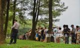 Warga menyaksikan proses evakuasi korban pesawat yang jatuh di Lapangan Sunburst Bumi Serpong Damai (BSD), Tangerang Selatan, Banten, Ahad (19/5/2024). Pesawat jenis Cessna 2006 dengan kode registrasi PK-IFP TECNAM milik Indonesia Flying Club terjatuh dikawasan tersebut sekitar pukul 13.45 WIB yang menyebabkan tiga orang meninggal dunia yakni satu orang penerbang, satu orang teknisi dan satu orang penumpang. Sementara, tim dari Komite Nasional Keselamatan Transportasi bersama Inspektorat Penerbangan dari Ditjen Perhubungan Udara serta kepolisian setempat belum memberikan keterangan dan masih mendalami penyebab terjadinya kecelakaan pesawat tersebut. (FOTO : Republika/Thoudy Badai)