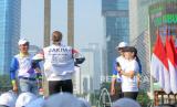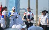 REPUBLIKA.CO.ID, JAKARTA -- PJ Gubernur Gubernur DKI Heru Budi Hartono saat menyematkan Rompi BTN Jakarta International Maratahon 2024 (JAKIM) kepada Mantan Puteri Indonesia 2002 Melanie Putria Dewita Sari dalam rangkaian acara Pencanangan HUT DKI Jakarta ke-497 di Bundaran Hotel Indonesia Jakarta, Ahad (19/05/2024).