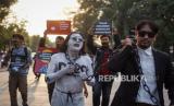 Wartawan dengan aksi teatrikal melakukan aksi unjuk rasa menolak Rancangan Undang-Undang (RUU) Penyiaran di Solo, Jawa Tengah, Selasa (21/5/2024). Aksi tersebut sebagai bentuk penolakan terhadap revisi Undang-undang nomor 32 tahun 2002 tentang penyiaran yang dinilai membatasi kebebasan pers dan kebebasan sipil hingga partisipasi publik. (FOTO : ANTARA FOTO/Mohammad Ayudha)