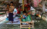 Sejumlah anak pengungsi Rohingya bermain di dalam tenda gubuk yang dijadikan hunian sementara di Pekanbaru, Riau, Selasa (21/5/2024). Sebanyak 154 orang pengungsi Rohingya yang berasal dari Aceh ini terpaksa tinggal sementara di tenda-tenda gubuk yang didirikan di lahan masyarakat sebelum nantinya akan ditempatkan di lokasi yang disiapkan oleh pemerintah daerah setempat. (FOTO : ANTARA FOTO/Rony Muharrman)