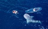REPUBLIKA.CO.ID, BONE BOLANGO. -- Pengunjung menaiki perahu wisata untuk melihat Hiu Paus (Rhincodon Typus) di objek wisata Desa Botubarani, Kabupaten Bone Bolango, Gorontalo, Rabu (22/5/2024).