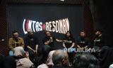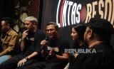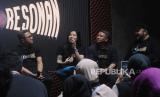 Perwakilan Lintas Resonan Wendi Putranto (tengah) berbicara saat akan di gelar acara musik Lintas Resonan di Jakarta, Rabu (22/5/2024). (FOTO : Dok.Republika)