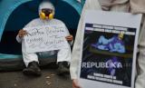 Sejumlah aktivis lingkungan dari Walhi (Wahana Lingkungan Hidup Indonesia) Jawa Barat melakukan aksi untuk Sungai Citarum di depan Gedung Sate, Kota Bandung, Rabu (22/5/2024). Aksi tersebut di antaranya menolak diperpanjangnya program Citarum Harum karena dianggap masih belum berdampak terhadap kodisi Sungai Citarum, mengembalikan kondisi DAS Citarum yang bersih dan bermanfaat, serta mempertahankan fungsi DAS Citarum sebagai daerah konservasi sekaligus sumber kehidupan masyarakat. (FOTO : Edi Yusuf/Republika)