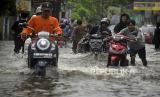 REPUBLIKA.CO.ID, BANTEN -- Sejumlah warga mendorong sepeda motor yang mogok saat melewati banjir di Jalan Sumur Bor, Kelapa Dua, Serang, Banten, Kamis (23/5/2024).