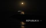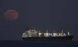 Bulan purnama bunga muncul di belakang kapal yang berlabuh di luar pelabuhan, di kota pesisir selatan Larnaca, di pulau Siprus di Mediterania timur, Kamis, (23/5/2024). (FOTO : AP)
