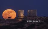Bulan bunga terbit di belakang kuil kuno Poseidon di Tanjung Sounion, sekitar 70 kilometer (45 mil) selatan Athena, Yunani, pada Kamis, (23/5/2024). (FOTO : AP)