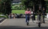 Pengunjung mengendarai skuter listrik saat berwisata di Kebun Raya Bogor, Kota Bogor, Jawa Barat, Jumat (24/5/2024). Libur Hari Raya Waisak, cuti bersama serta libur akhir pekan dimanfaatkan oleh warga untuk mengunjungi destinasi wisata Kebun Raya Bogor yang memiliki ribuan koleksi tanaman. Kebun Raya Bogor menargetkan 60.000 pengunjung pada libur panjang yang dibarengi dengan HUT Kebun Raya Bogor ke-207. (FOTO : Republika/Putra M. Akbar)