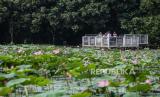 Pengunjung melihat bunga teratai saat berwisata di Kebun Raya Bogor, Kota Bogor, Jawa Barat, Jumat (24/5/2024). Libur Hari Raya Waisak, cuti bersama serta libur akhir pekan dimanfaatkan oleh warga untuk mengunjungi destinasi wisata Kebun Raya Bogor yang memiliki ribuan koleksi tanaman. Kebun Raya Bogor menargetkan 60.000 pengunjung pada libur panjang yang dibarengi dengan HUT Kebun Raya Bogor ke-207. (FOTO : Republika/Putra M. Akbar)