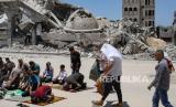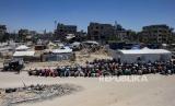 REPUBLIKA.CO.ID,  GAZA. --  Pengungsi Palestina melaksanakan salat Jumat di samping reruntuhan Masjid Al-Islam, yang sebelumnya hancur akibat serangan udara Israel, di Khan Yunis, Jalur Gaza selatan, (24/5/2024).