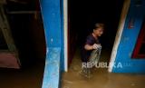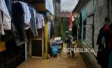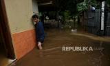 Warga berjalan melewati pemukiman yang terendam banjir di Jalan Kemuning Dalam 4, Pejaten Timur, Pasar Minggu, Jakarta Selatan, Sabtu (25/5/2024). Sebanyak sekitar 18 rumah terendam banjir sejak dini hari sekitar pukul 02.00 WIB yang diduga akibat luapan sungai Ciliwung. Saat ini banjir di lokasi tersebut berangsur surut dari sebelumnya ketinggian air mencapai 2,6 meter, kini tinggal sekitar 45 centimeter. (FOTO : Republika/Thoudy Badai)