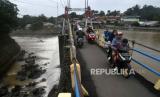 Sejumlah pengendara motor melintasi jembatan Bendung Katulampa di Kota Bogor, Jawa Barat, Sabtu (25/5/2024). Hujan deras di kawasan Puncak, Bogor dan sekitarnya menyebabkan Tinggi Muka Air (TMA) Bendung Katulampa, Bogor naik mencapai angka 140 cm dengan status siaga tiga pada Jumat (24/5/2024) malam pukul 21.30 WIB. (FOTO : ANTARA FOTO/Arif Firmansyah)