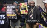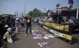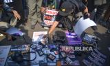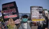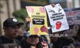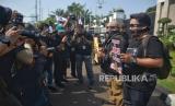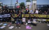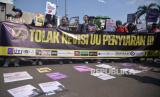 Sejumlah orang yang terdiri dari organisasi profesi wartawan, pekerja kreatif dan pers mahasiswa melakukan aksi damai menolak revisi Undang-Undang Penyiaran di depan kompleks Parlemen, Senayan, Jakarta, Senin (27/5/2024). Dalam aksinya mereka menolak pasal-pasal bermasalah dalam revisi Undang-Undang Penyiaran yang sedang dibahas di DPR RI. Pasal-pasal tersebut akan membungkam kebebasan pers dan kebebasan berekspresi di Indonesia, yang merupakan pilar utama dalam sistem demokrasi. (FOTO : Republika/Prayogi)