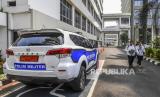 REPUBLIKA.CO.ID, JAKARTA -- Pegawai Kejagung melintas di samping mobil Polisi Militer yang terparkir di Gedung Kejaksaan Agung, Jakarta, Senin (27/5/2024).